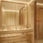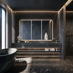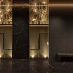 - Materiales seleccionados a mano de canteras italianas: Nero Saint Laurent, Camelia Green, Covelano Macchia Vecchia, Travertino Giallo.